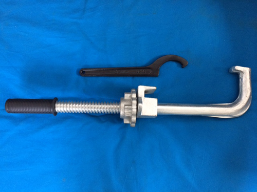 b:勾型扳手外鎖式,用手將手輪旋到手把處,卡軌塊移到手輪處,鉤鎖器鉤頭從鋼軌外底部穿過,鉤頭鉤住尖軌軌底,把卡軌塊推到鋼軌處,用手轉(zhuǎn)動手輪到卡軌塊,用鉤型扳手扭緊,對準(zhǔn)鎖孔上鎖即可,拆除反方向才做即可。