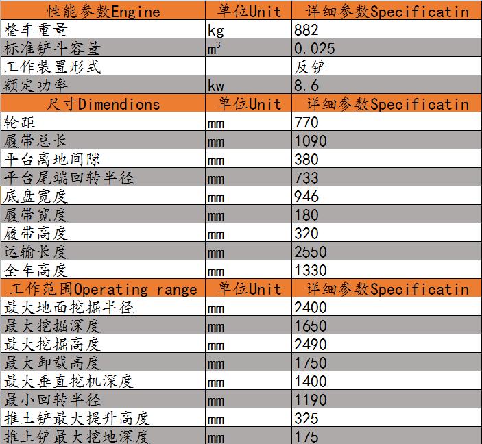 6、整體采用無尾回轉設計, 當機體上部回轉時,在履帶范圍內的狹長的區域內可隨意進行回轉作業,拓展了機器的應用范圍,工作效率高。相對于其他的小型挖掘機的有尾設計,回轉安全性上具有明顯優勢。