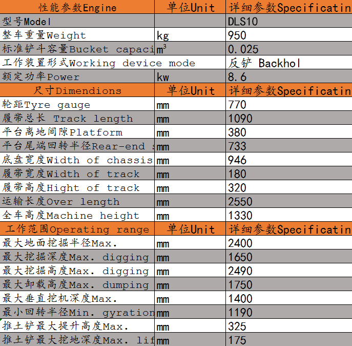 DLS10微型履帶挖掘機參數