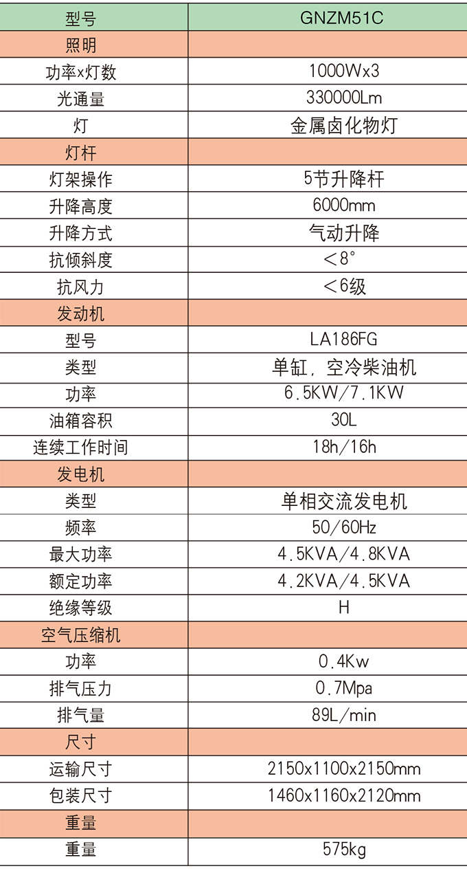 沃爾華GNZM51C氣動升降拖車式照明車基本配置