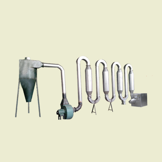 該機主要由熱風爐、U型脈沖管、風機、剎克隆等部分組成,在引風機作用下熱風和物料同時被吸入管道中。含水物料懸浮于高速熱氣流中,通過干燥管道。由于脈沖管作用,氣流發生旋轉,使物料不斷翻滾,增大了與熱氣流的傳熱交換,提高了熱效率。物料在3-5秒時間內即完成干燥,被旋風分離器及袋式收集器收集。回收效率高達98%,可連續干燥大量物料。