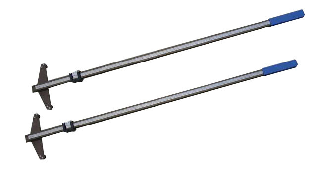 支距尺主要有刻線長度1300mm和1400mm兩種規格鐵路支距尺,它包括有尺身和標度尺,其特征在于該支距尺尺身為雙工形型材結構,型材為上下兩邊帶有水平外沿延伸的方形管,在上邊外沿延伸兩邊的內側順向開有槽口帶有標度尺的不銹鋼板順著槽口放入,鑲在支距尺的上 面,在其外端以帶有凸出的銷釘固定,尺身里端垂直固定有十字板,十字板下面固定有測頭,尺身中間裝有滑動游框,尺身、標度尺和游框裝在一起成一整體測距裝置