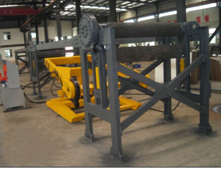 該裝置布置在伸縮帶式輸送機貯帶倉的后方,整套設備的動力均由液壓泵站提供。當貯帶倉貯滿輸送帶時,先通過固定夾帶裝置把皮帶夾住,防止皮帶跑掉,當卷帶完成皮帶接頭連好后才能松開。抽帶機構由液壓馬達帶動上滾筒轉動,下滾筒由兩個液壓油缸支起,將皮帶壓在上下滾筒之間,隨著液壓馬達不斷的轉動,皮帶就松弛下來,此時將皮帶接頭拆開,就可以進行卷帶,卷帶結束后,支承下滾筒的液壓油缸松開,下滾筒復位。卷帶機構由液壓馬達帶動,卷帶力大,速度可控,可卷帶長120米左右,搖臂可上下左右擺動以保證卷帶整齊,并可實現180°內旋轉把卷好的皮帶移出皮帶機架。