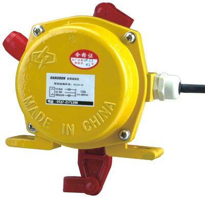 當外力作用于開關拉繩的任何一處位置時,即可使開關的拉桿旋轉,當拉桿旋轉20°時,開關輸出停機信號,同時開關鎖定,并保持該狀態。當開關復位時,必須按壓其復位按鈕,開關解鎖復位,拉桿回到正常位置。